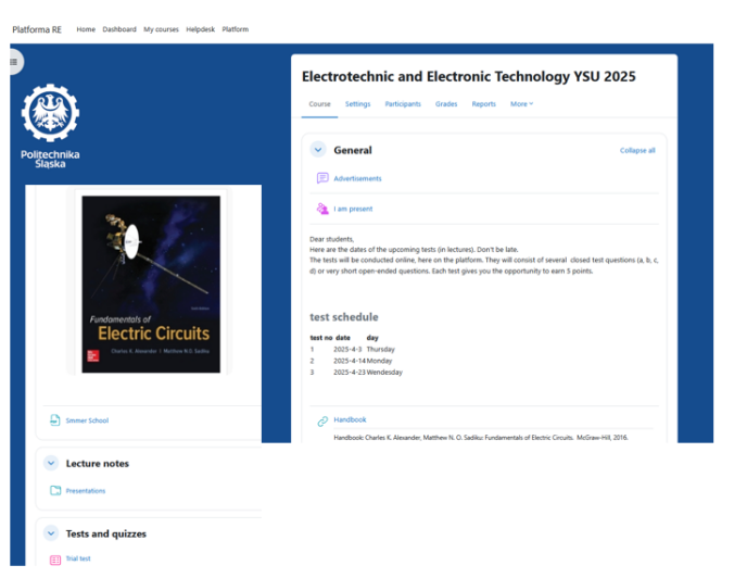 《电工与电子技术》(Electrotechnics and Electronics Technology )是西里西亚智能科学与工程学院机械设计、制造及其自动化专业本科二年级学生的必修课程,该课程共计64学时,4学分,采用全英文教学模式,春季学期开设。课程由波兰西里西亚技术大学与燕山大学电气工程学院中外双方教师联合授课。该课程以电工技术和电子技术为基础,融合了直流电路、交流电路、模拟电路和数字电路等内容,以解决工程领域的实际问题为导向,旨在培养学生的专业素养及创新思维,对实现专业培养目标具有重要支撑作用。