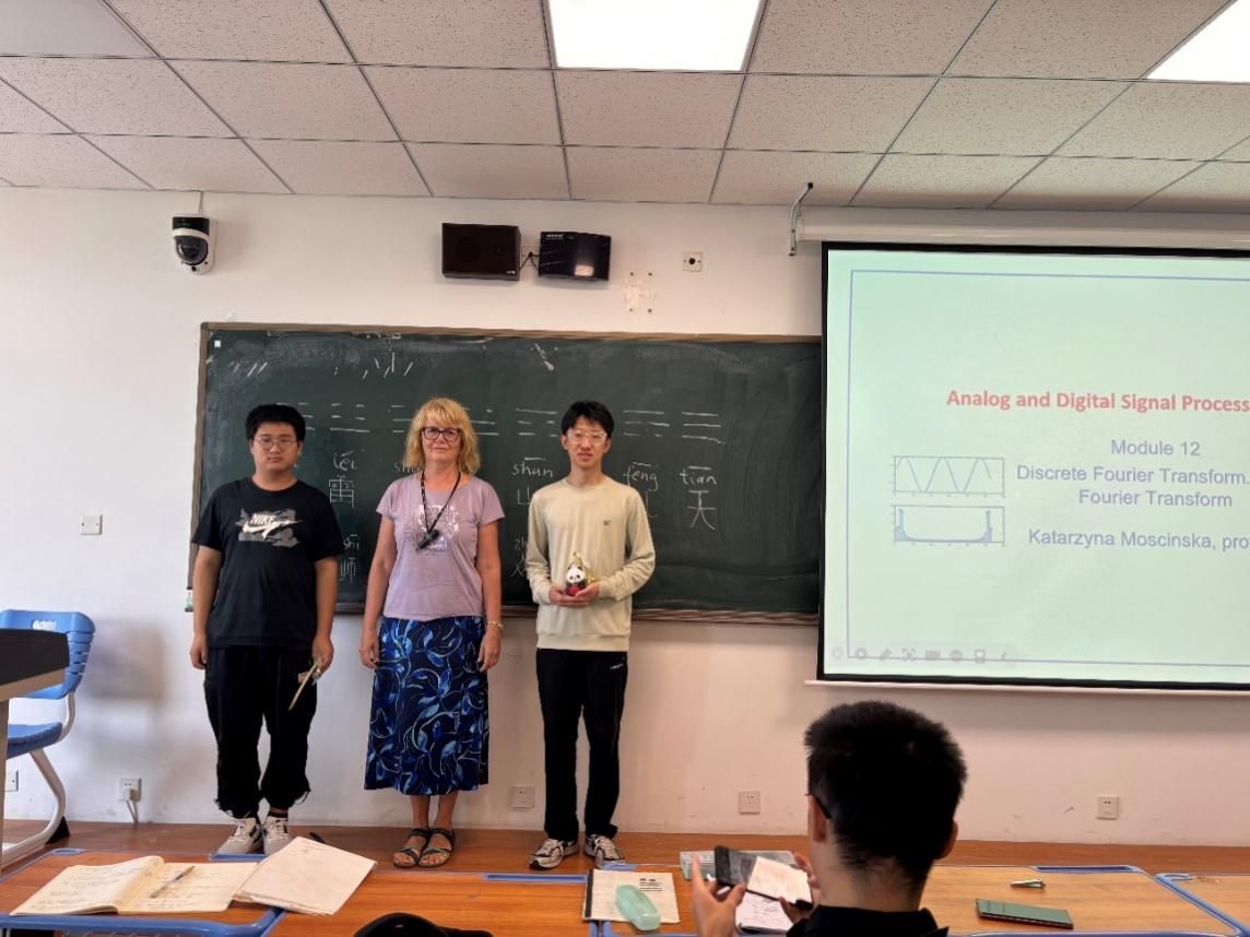 Specifically, Prof. Katarzyna was responsible for delivering the theoretical knowledge of the course. Her teaching was characterized by accurate English expression and well-organized content, and explained profound theories in simple and well-structured manner. To facilitate student learning, she combined slides with blackboard writing in each lecture to highlight key points and difficult topics, explained with as many examples as possible and gradually broke down complicated problems, effectively helping students understand the key knowledge points. Furthermore, Prof. Katarzyna emphasized classroom interaction, actively encouraging students to voice their opinions and participate in discussions, fostering a positive and engaging learning atmosphere.Figure 1 shows a photo of Prof. Katarzyna teaching during a lecture. Figure 2 captures the scene when Prof. Katarzyna was rewarding hardworking students.